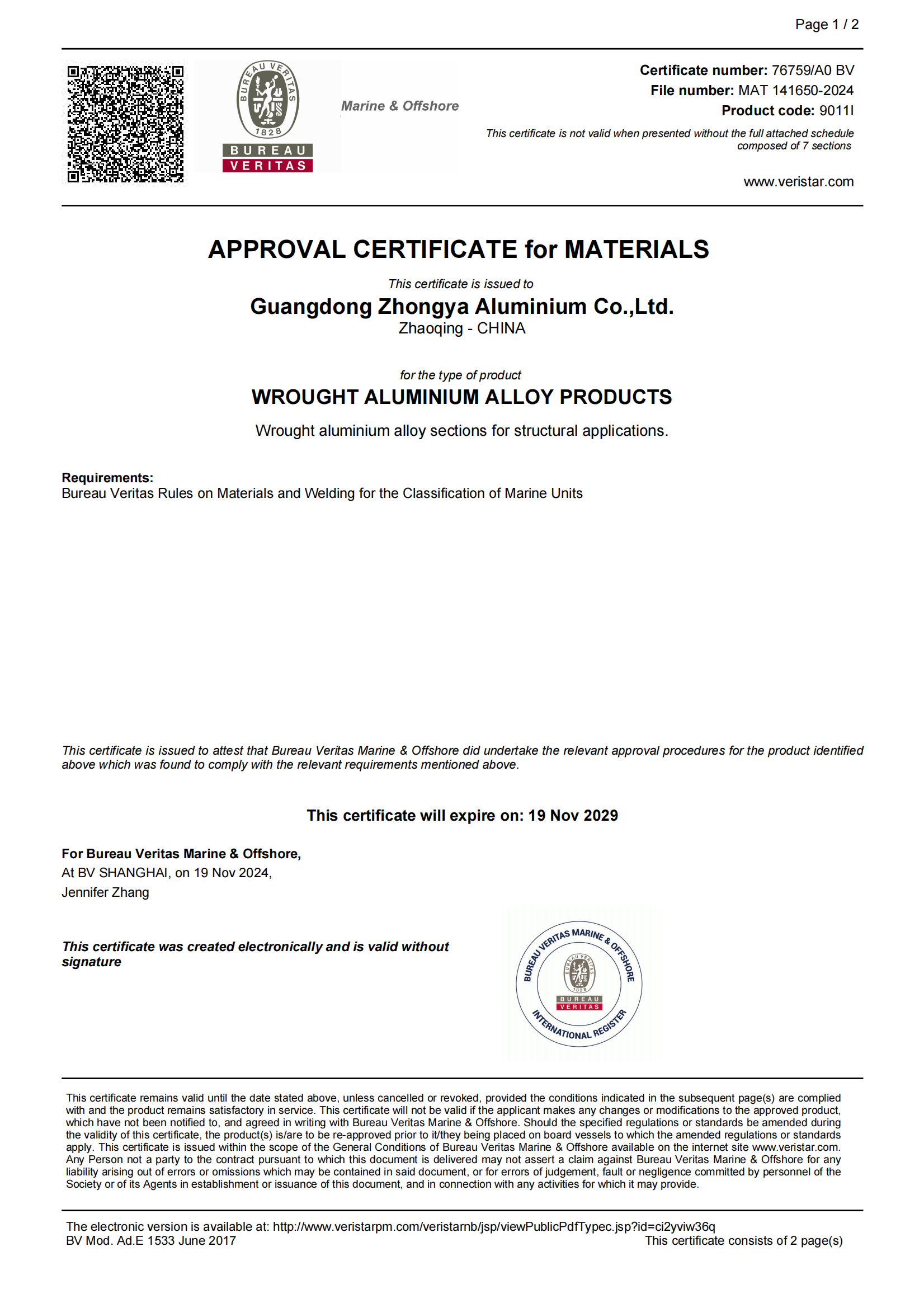 BV材料批準(zhǔn)證書(shū) 變形鋁2