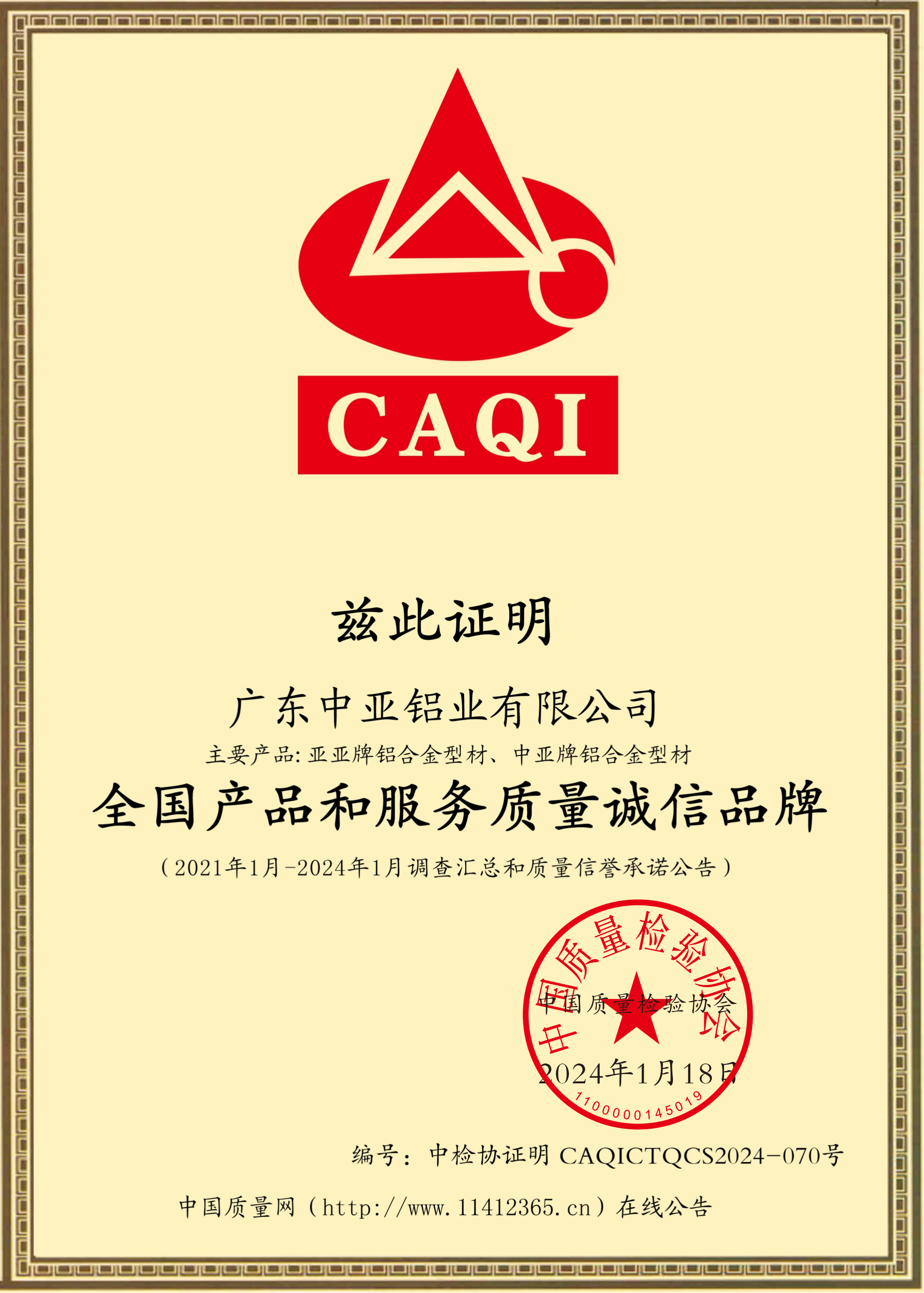 全國鋁型材行業(yè)質量領先企業(yè)