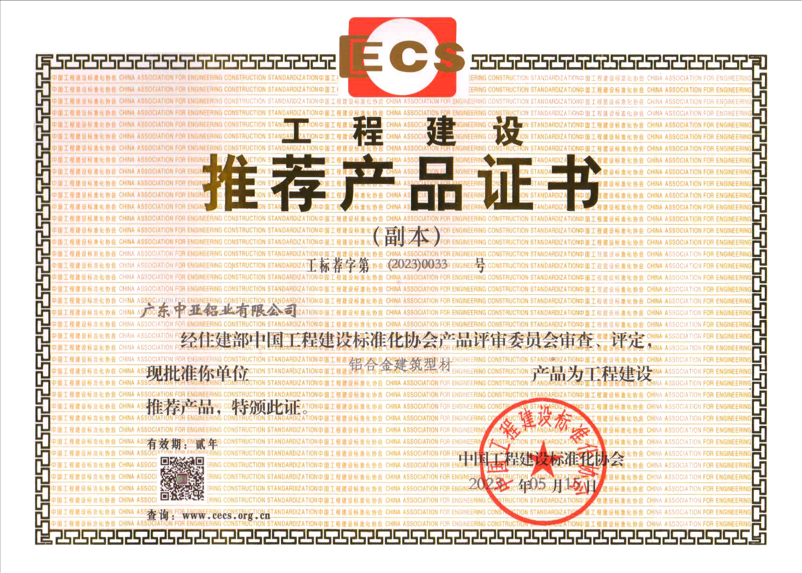 工程建設推薦產(chǎn)品證書-鋁合金建筑型材